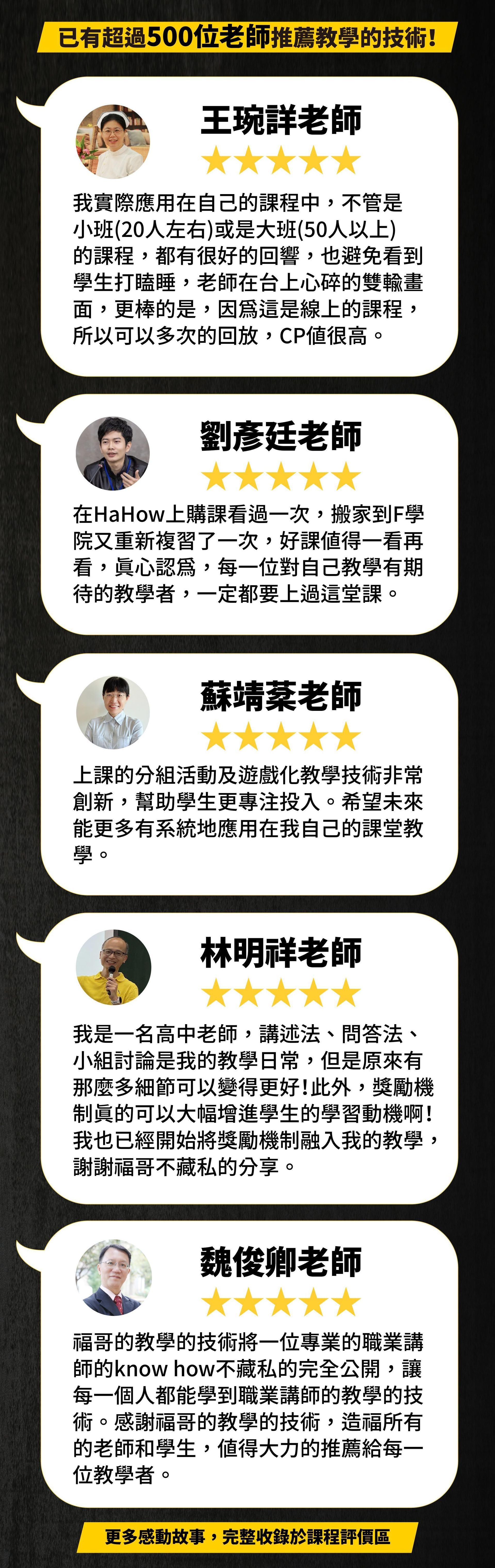 職業講師迄今15年經歷,經常創下滿意度及NPS滿分之完全課程紀錄。多家上市公司主管課後極力推薦,評價為「上過最好的課程」、「一輩子絕不能錯過的好課」。城邦媒體集團何飛鵬執行長專欄中稱其為「追求完全比賽的職業選手」,法務部蔡清祥部長於記者會公開讚賞「從沒看過這麼好的迴響與肯定」、《親子天下》稱其為「昔日課堂魯蛇,變身為老師的教學教練」,更獲《天下雜誌》報導為「紙筆就能讓課堂變high」。