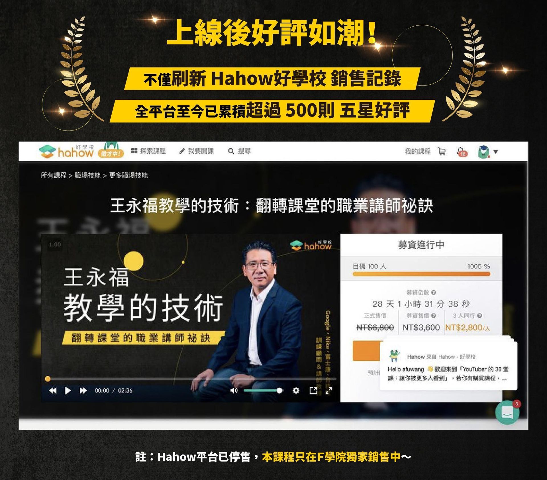 王永福(福哥),頂尖職業講師、簡報技巧及教學教練,資訊管理博士、F 學院創辦人。客戶包含台積電、鴻海、聯發科、西門子、各大金控、台大醫院、諾華、Google、Nike、Gucci、IKEA等知名企業,客戶涵蓋台灣百大上市公司七成以上。也是很多專業人士包含醫師、律師、會計師、檢察官們的簡報教練,以及老師們的老師、教練們的教練。