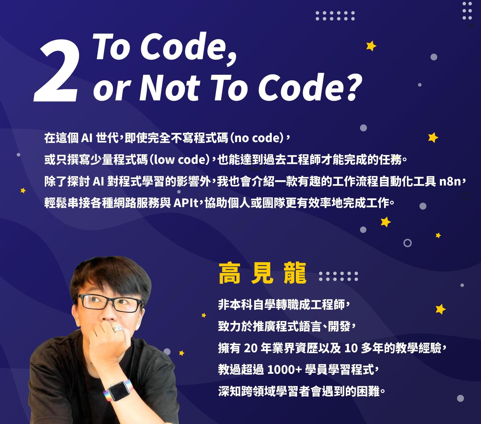 熱愛工作及生活,歷練過工地主任與保險業務,是2個孩子的超級奶爸,喜歡鑽研電腦、Espresso, 煎牛排的技術、愛聽爵士樂及吹薩克斯風。完成多場鐵人三項比賽,擁有PADI潛水長 / 合氣道黑帶/工地主任/EMBA/資訊管理博士 Ph.D 等資格。學術研究領域為教學技術及遊戲化教學。目前擔任傑福國際總經理,並為 F 學院創辦人。