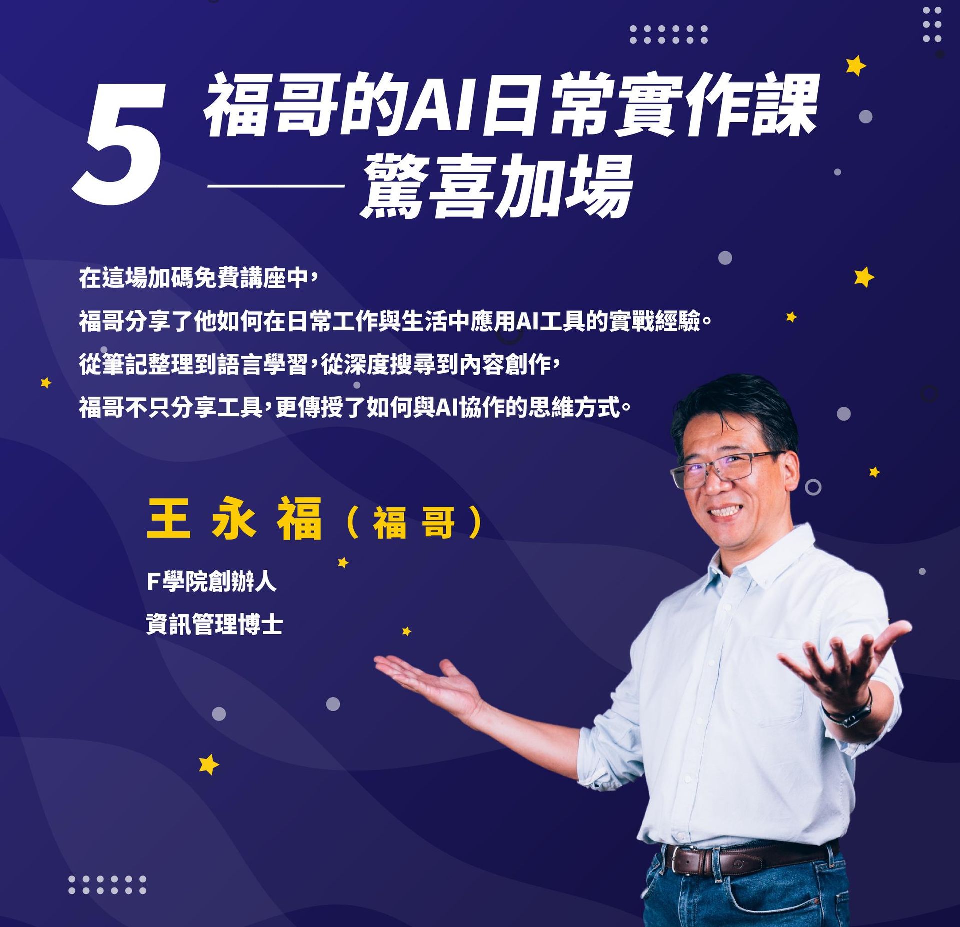 王永福(福哥),頂尖職業講師、簡報技巧及教學教練,資訊管理博士、F 學院創辦人。客戶包含台積電、鴻海、聯發科、西門子、各大金控、台大醫院、諾華、Google、Nike、Gucci、IKEA等知名企業,客戶涵蓋台灣百大上市公司七成以上。也是很多專業人士包含醫師、律師、會計師、檢察官們的簡報教練,以及老師們的老師、教練們的教練。