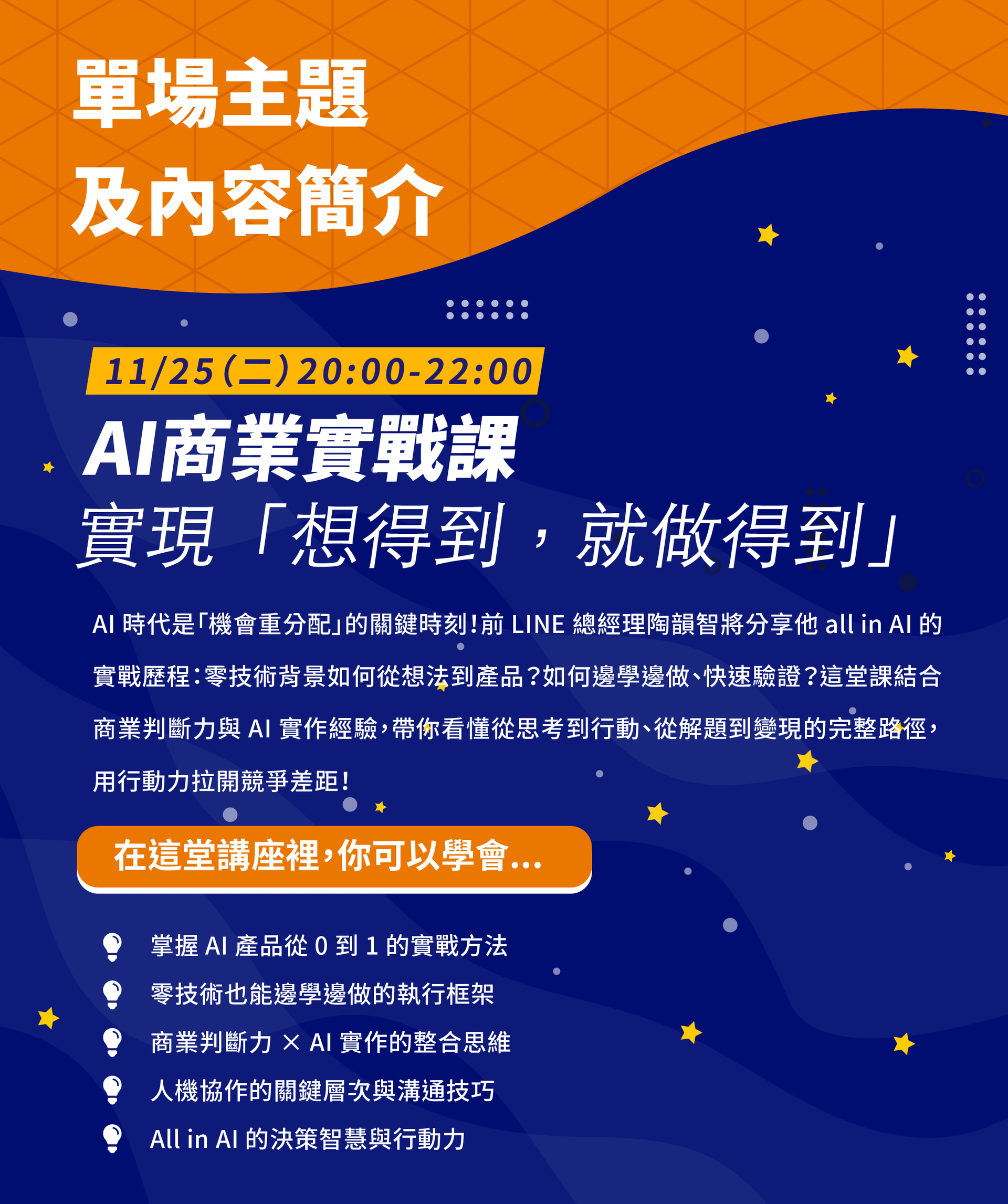 前 LINE 總經理陶韻智將分享他 all in AI 的實戰歷程:零技術背景如何從想法到產品?如何邊學邊做、快速驗證?這堂課結合商業判斷力與 AI 實作經驗,帶你看懂從思考到行動、從解題到變現的完整路徑,用行動力拉開競爭差距!