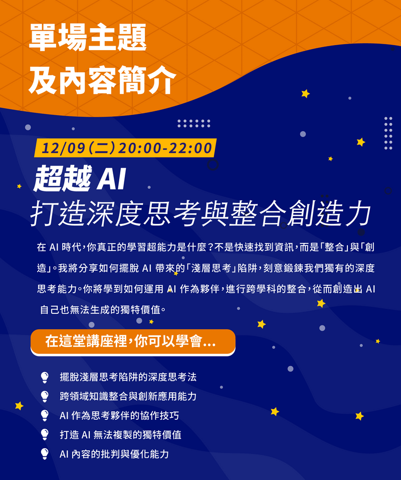 本方案包含以下直播場次: 12/9(二)超越 AI:打造深度思考與整合創造力