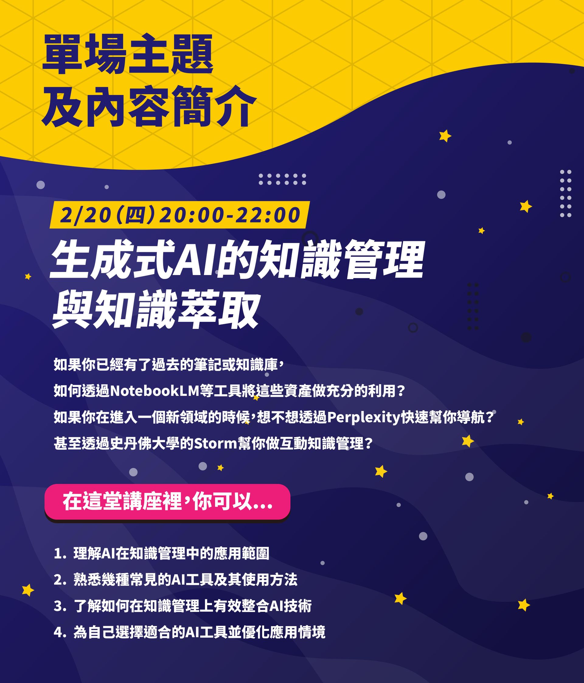 本方案包含以下直播場次: 2/20(四)生成式AI的知識管理與知識萃取