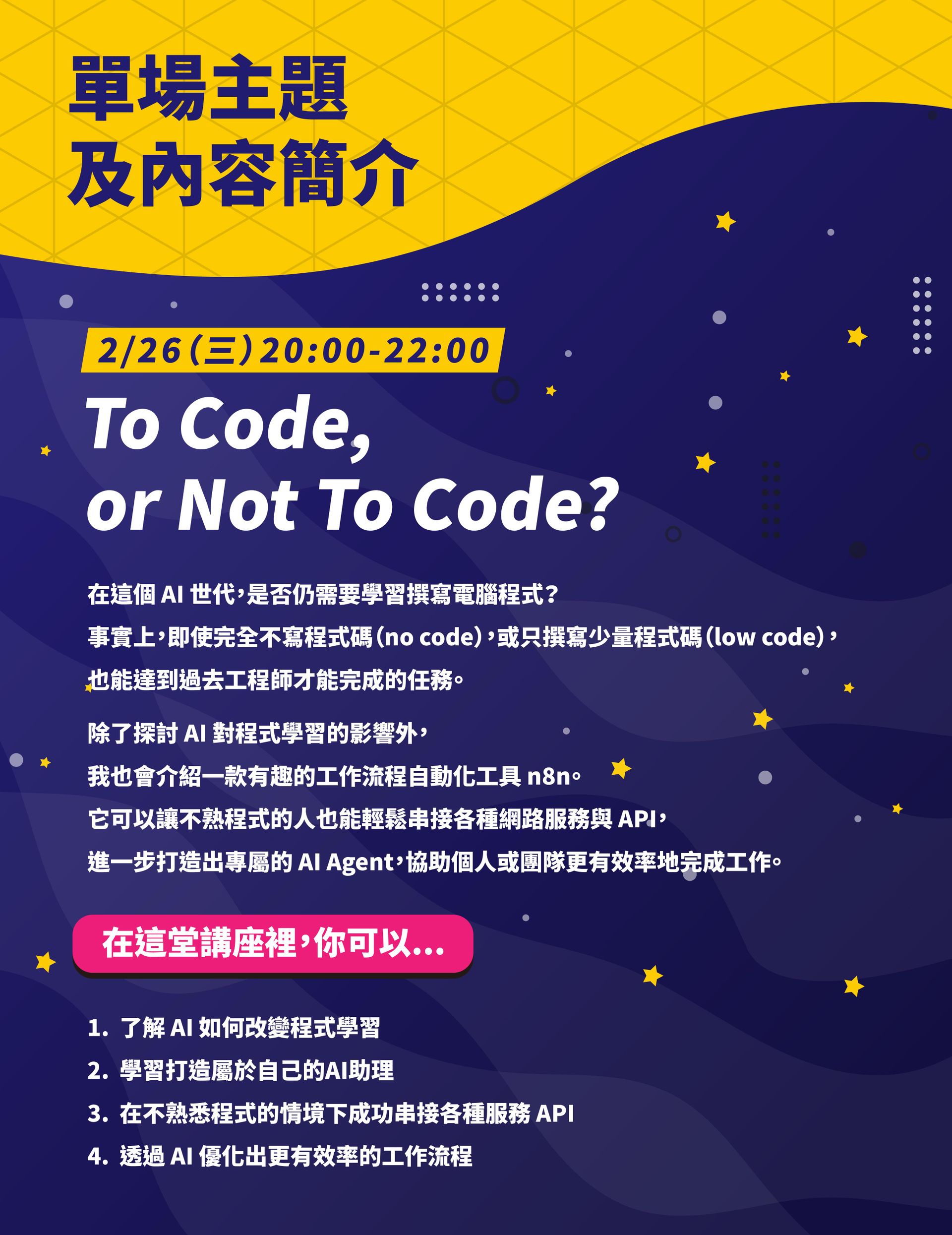本方案包含以下直播場次: 2/26(三)To Code, or Not To Code?