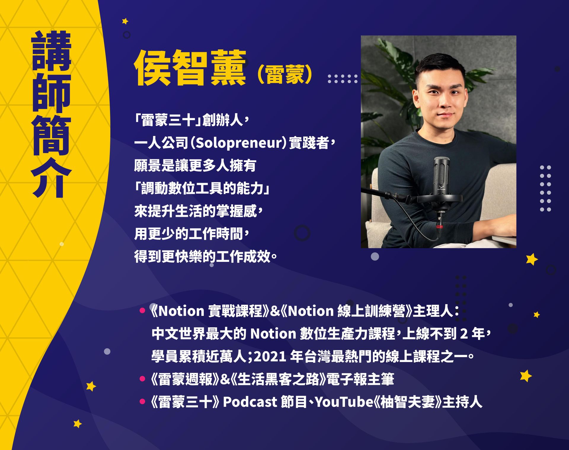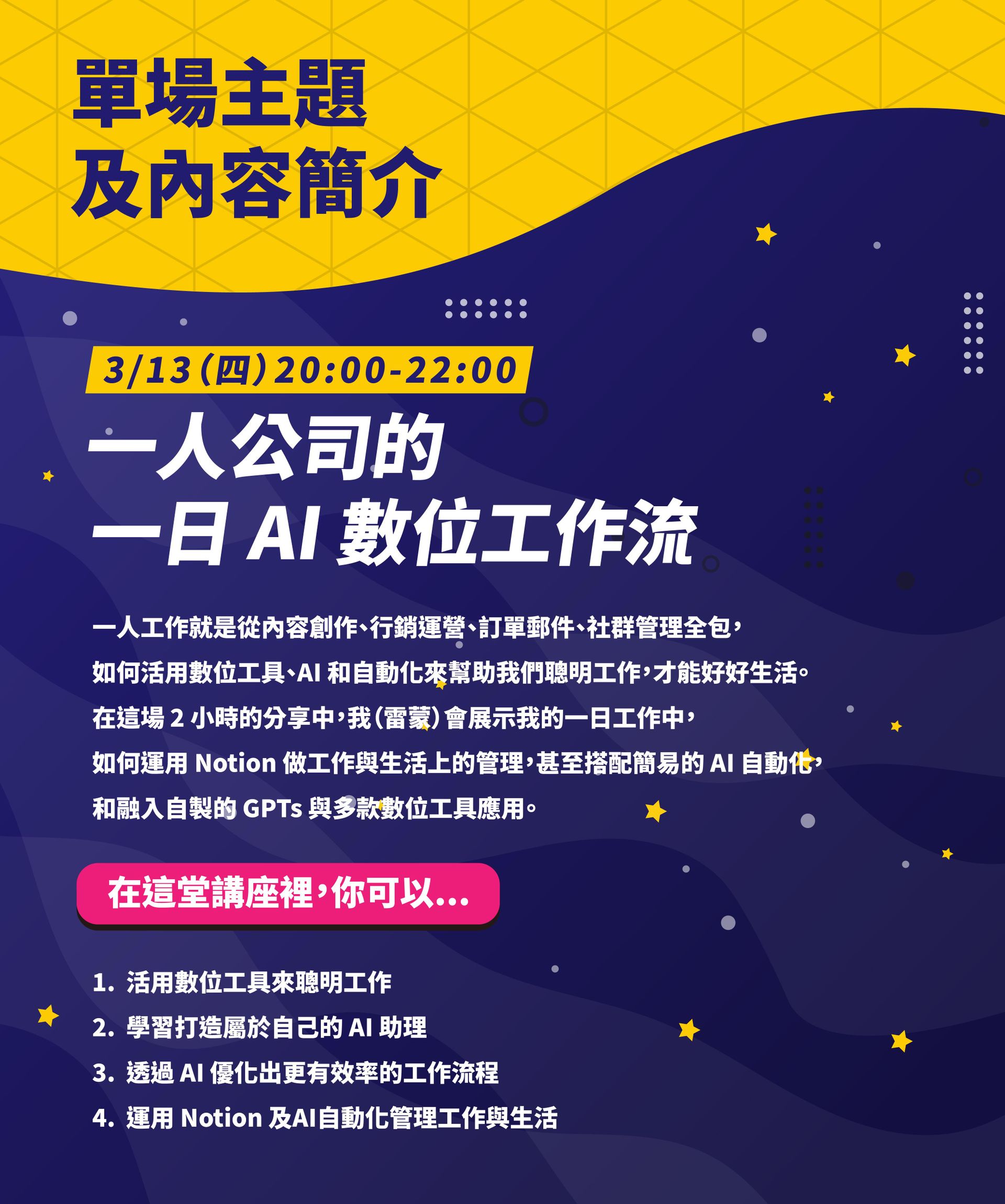 一人工作就是從內容創作、行銷運營、訂單郵件、社群管理全包,如何活用數位工具、AI 和自動化來幫助我們聰明工作,才能好好生活。在這場 2 小時的分享中,我(雷蒙)會展示我的一日工作中,如何運用 Notion 做工作與生活上的管理,甚至搭配簡易的 AI 自動化,和融入自製的 GPTs 與多款數位工具應用。