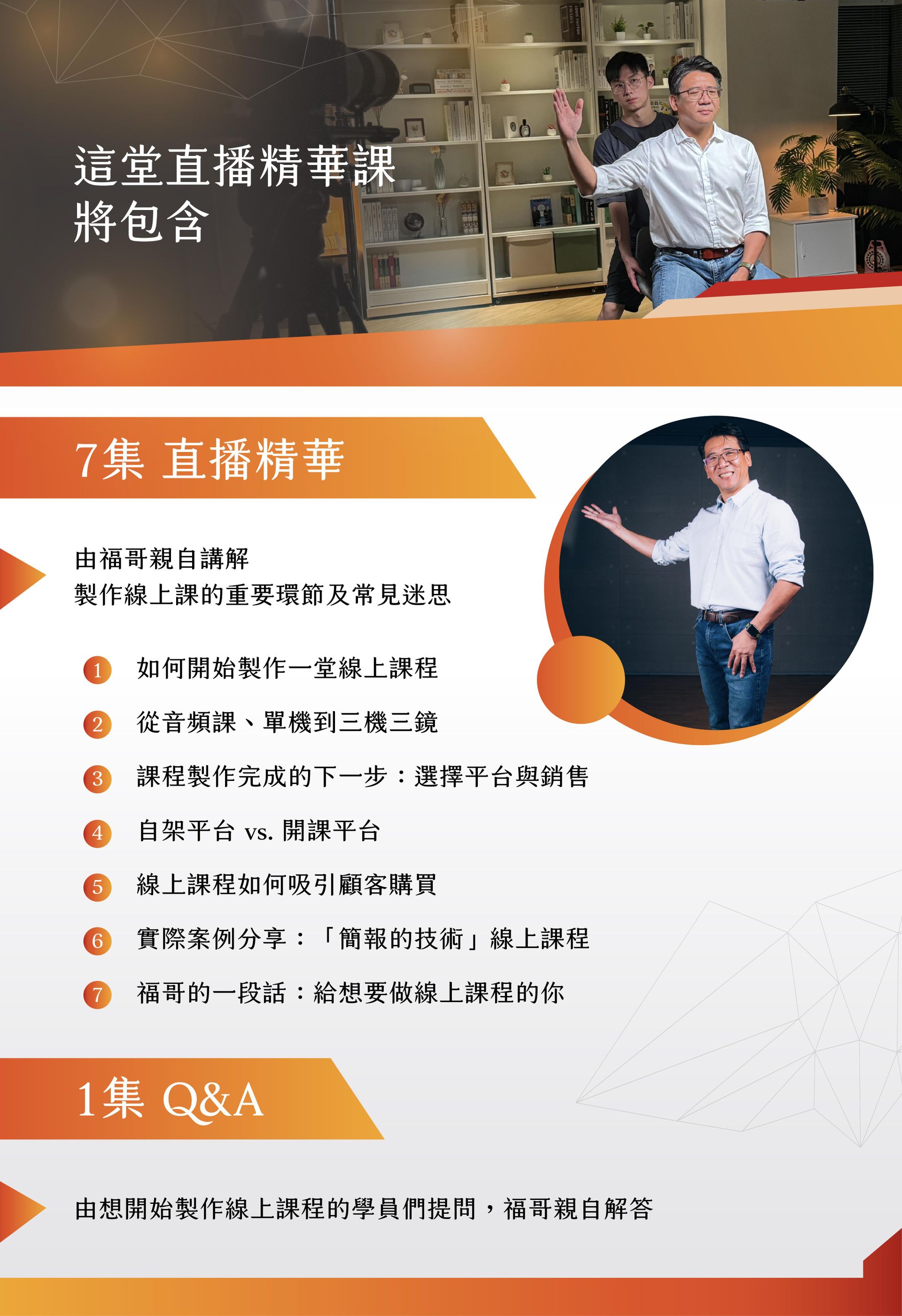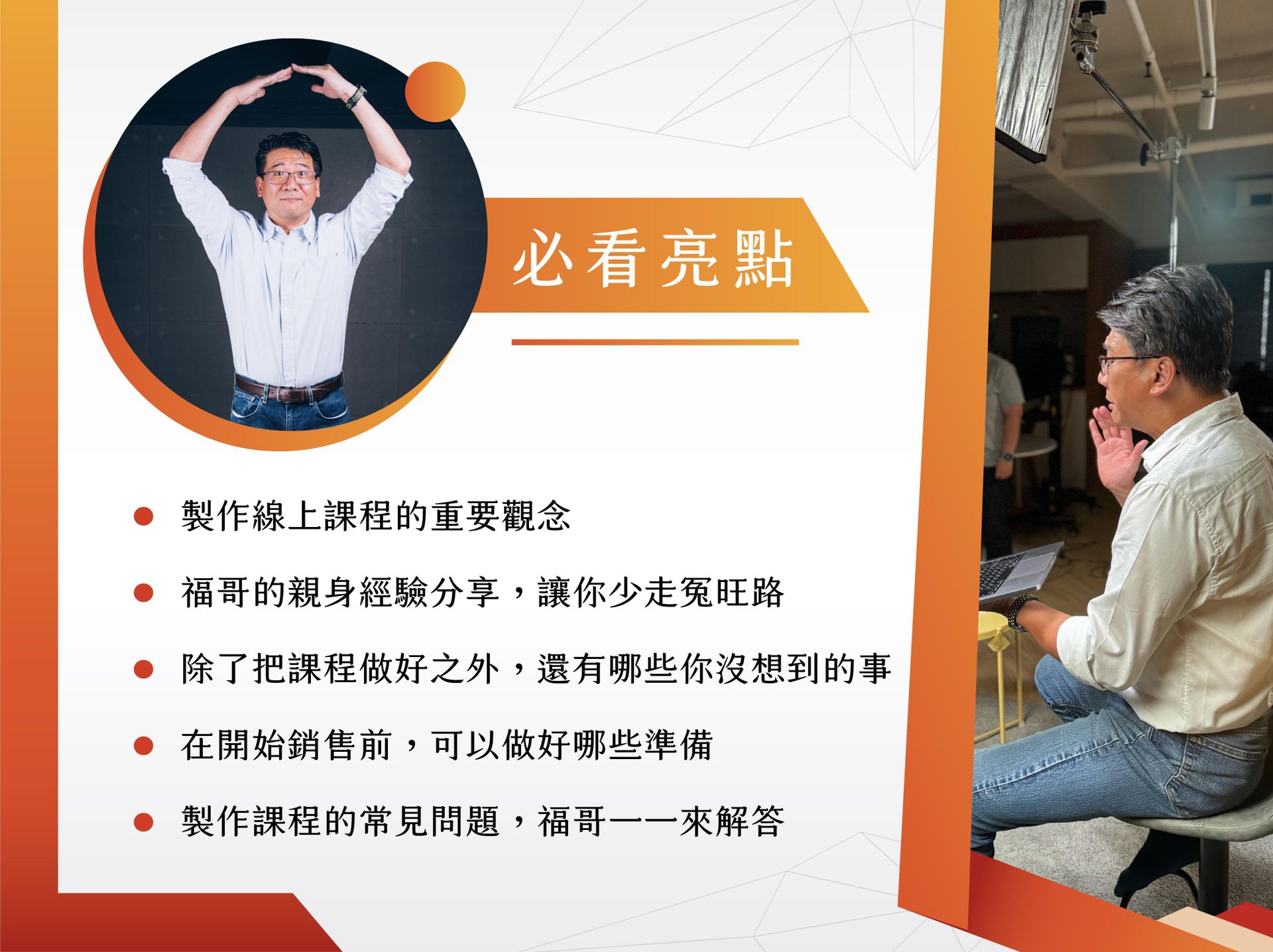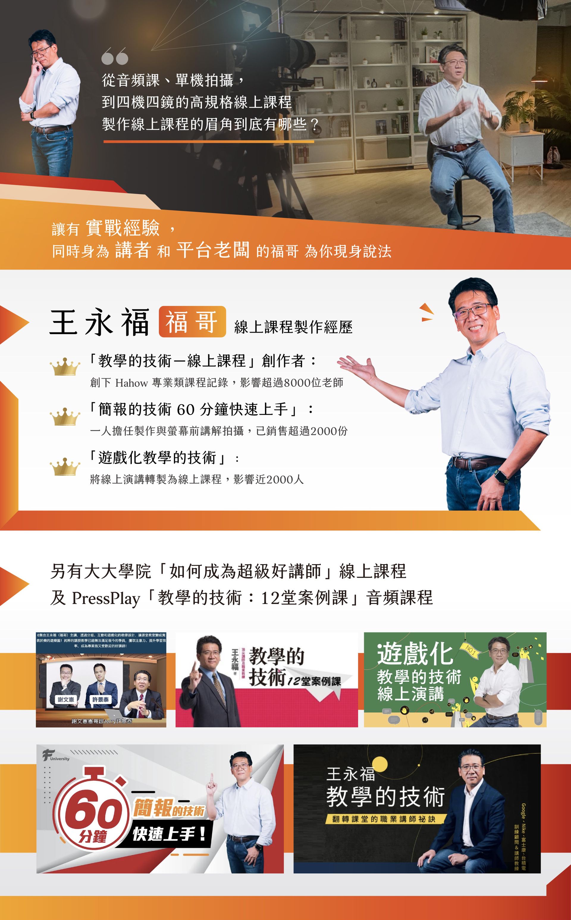 身兼課程製作、剪輯、創意發想、以及線上課程講師,還是 F 學院線上課程平台的創辦人。福哥從音頻課、單機自錄課、攝影棚拍課、雙機雙鏡實景課,甚至創新的三機三鏡,以及超高規格的四機四鏡課。曾配合過國內大型線上課程平台,也曾嘗試自架網站,最後找出最佳解決方。福哥將融合過去製作線上課程的所有經驗,整理成這門「製作線上課的技術」,有系統的教給大家。