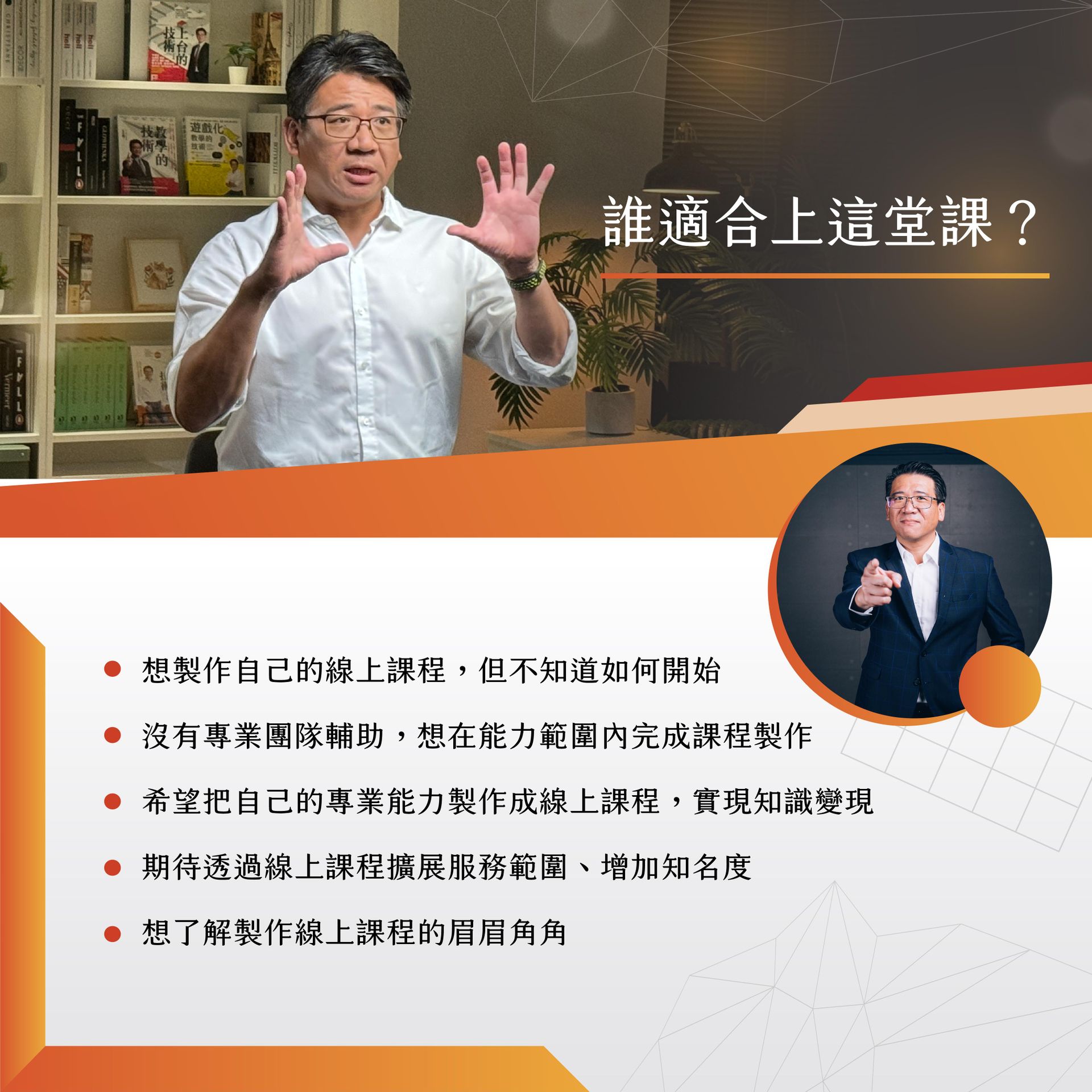你曾想製作一個屬於自己的線上課?卻不得其門而入?摸索了很久,卻不知道要怎麼開始?有沒有可能,用最快的方式,讓你也能快速上手,做出一門屬於自己的線上課程。