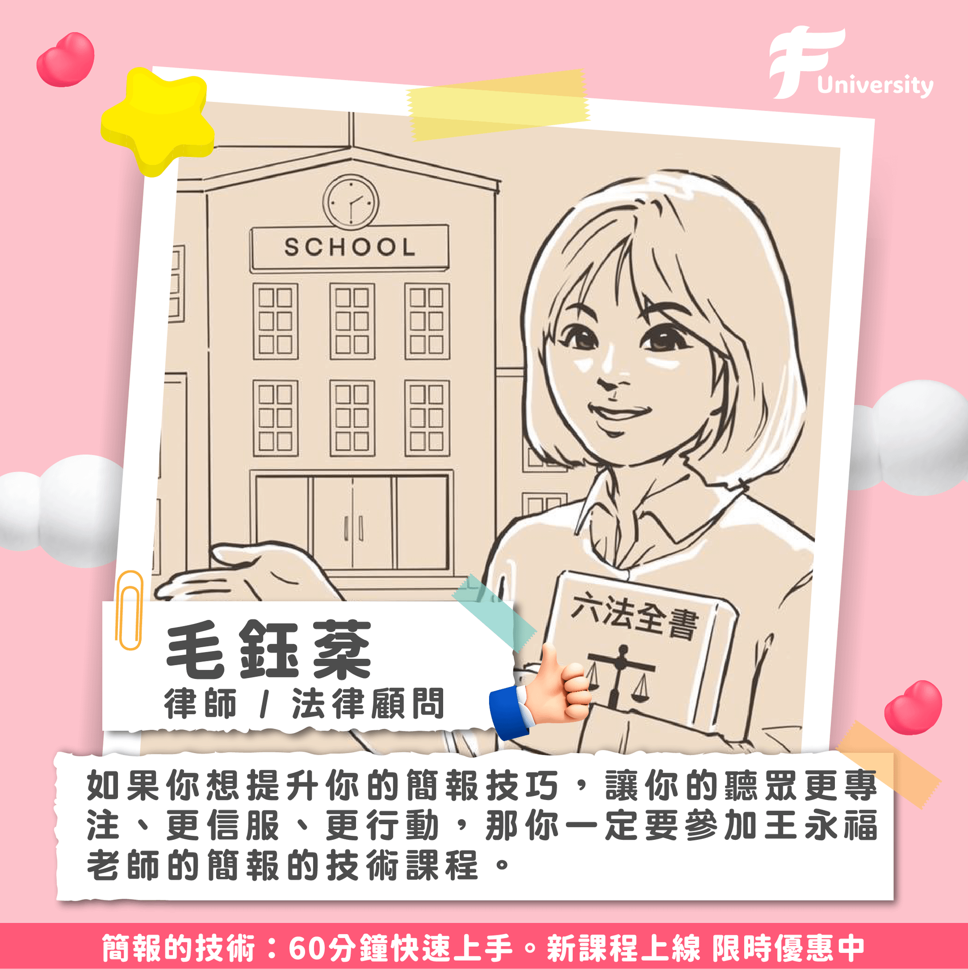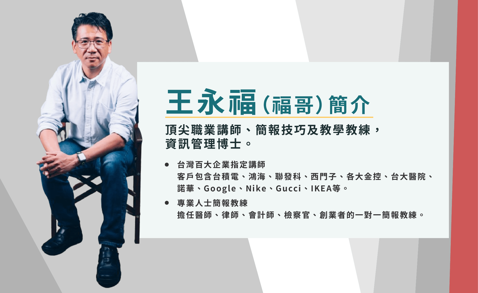 王永福(福哥),頂尖職業講師、簡報技巧及教學教練,資訊管理博士、F 學院創辦人。客戶包含台積電、鴻海、聯發科、西門子、各大金控、台大醫院、諾華、Google、Nike、Gucci、IKEA等知名企業,客戶涵蓋台灣百大上市公司七成以上。也是很多專業人士包含醫師、律師、會計師、檢察官們的簡報教練,以及老師們的老師、教練們的教練。