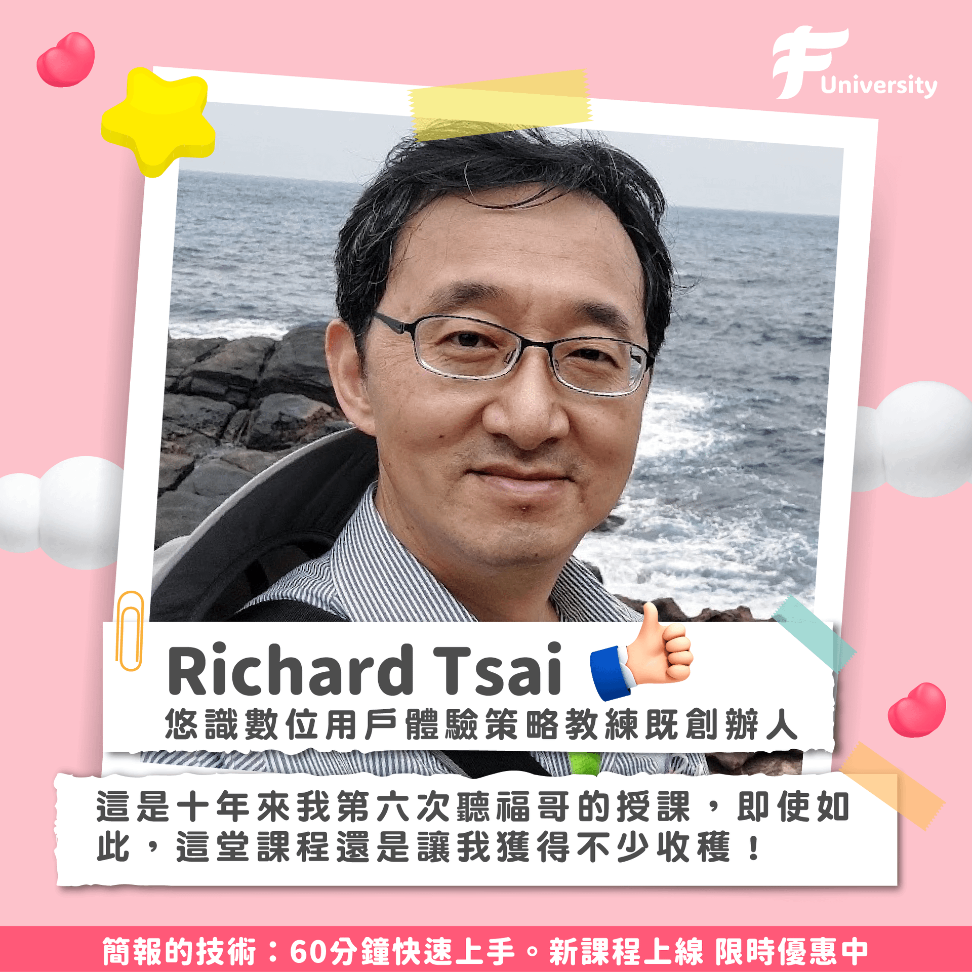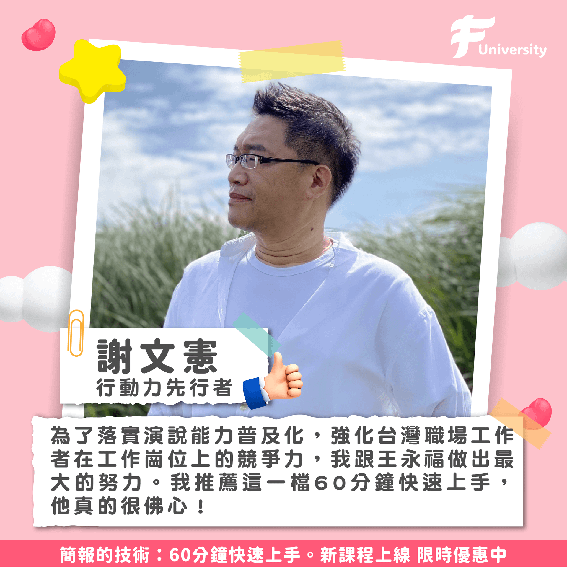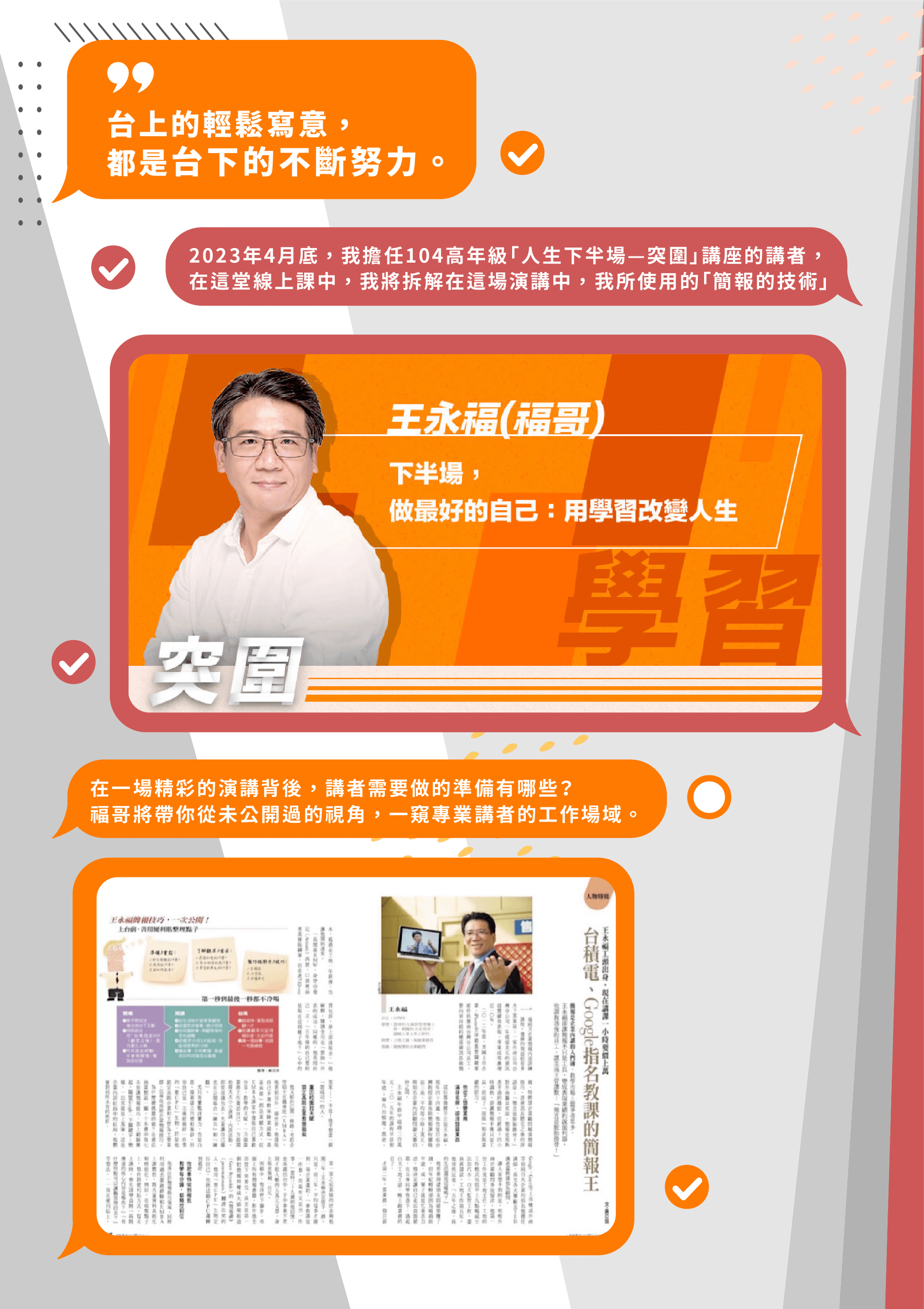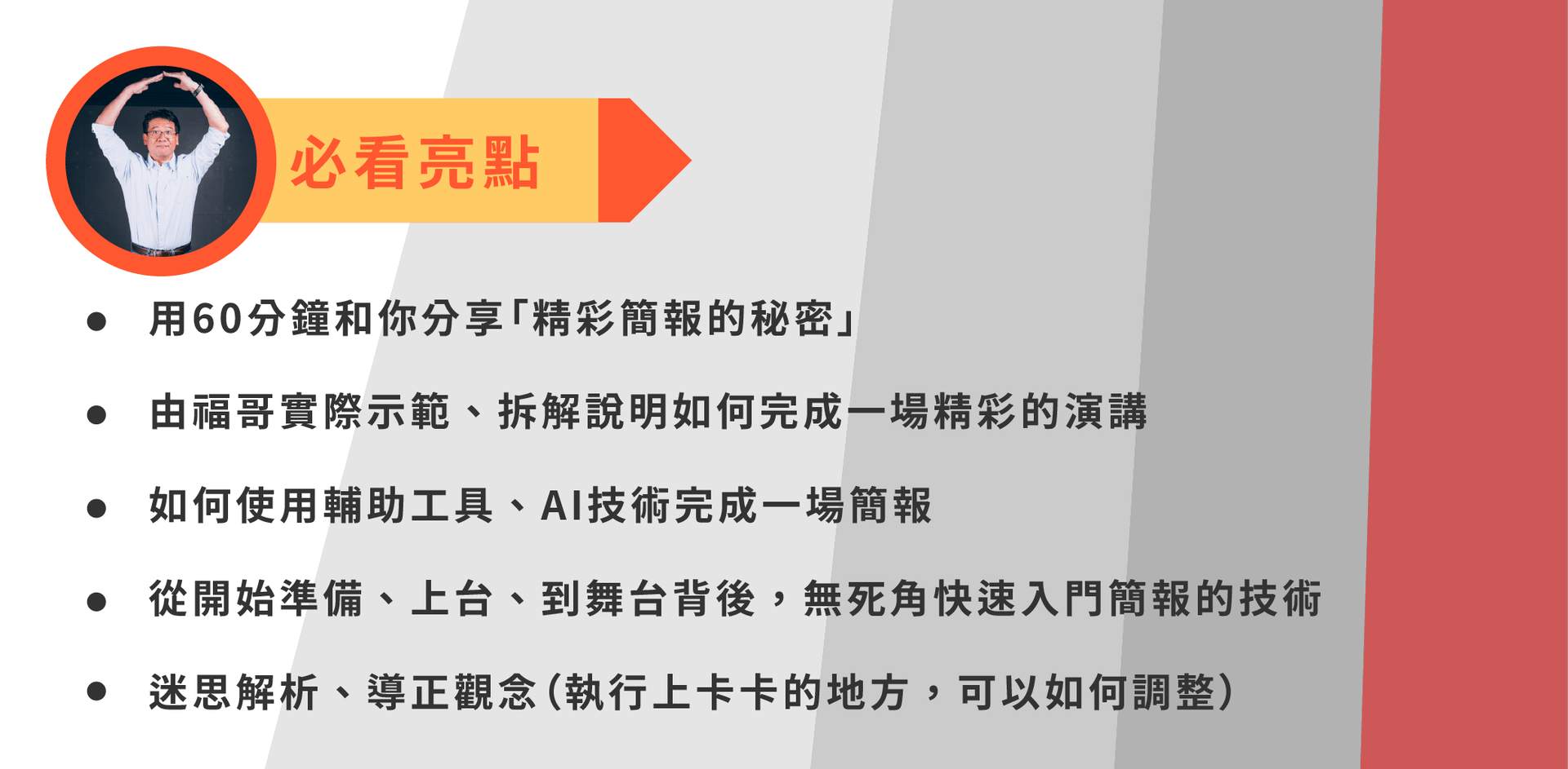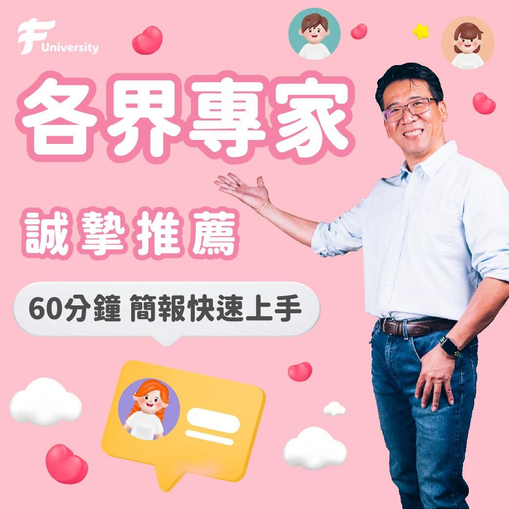 講師們的老師:王永福(福哥)開課啦~~這堂60分鐘的課程將由福哥親自講解、示範及分享簡報的技術,並教你可以如何與AI協作,縮小和聽眾間的距離,抓出故事線、做出精彩的投影片!手把手教你打造一場精彩演講,立即加入學習的行列吧!