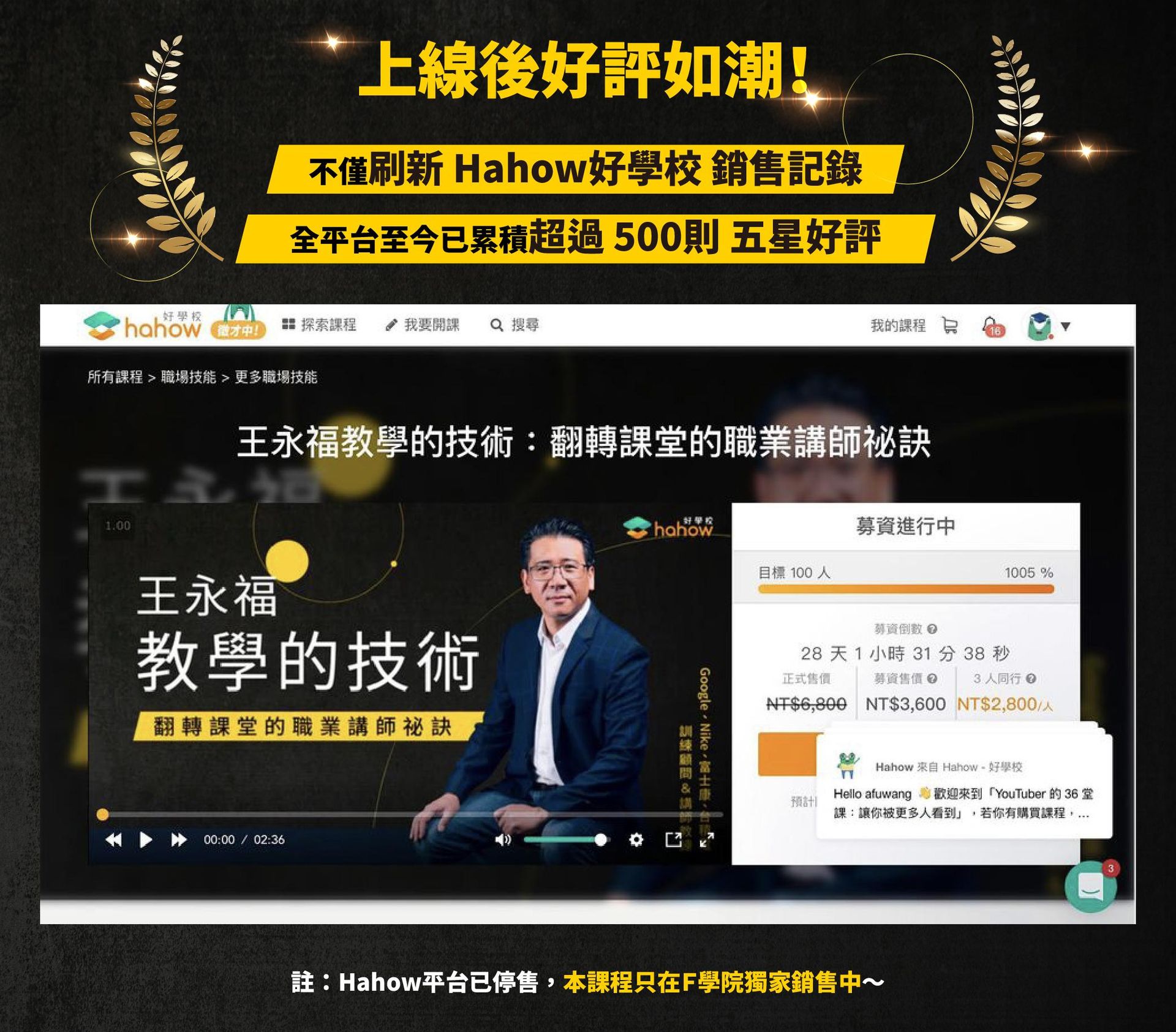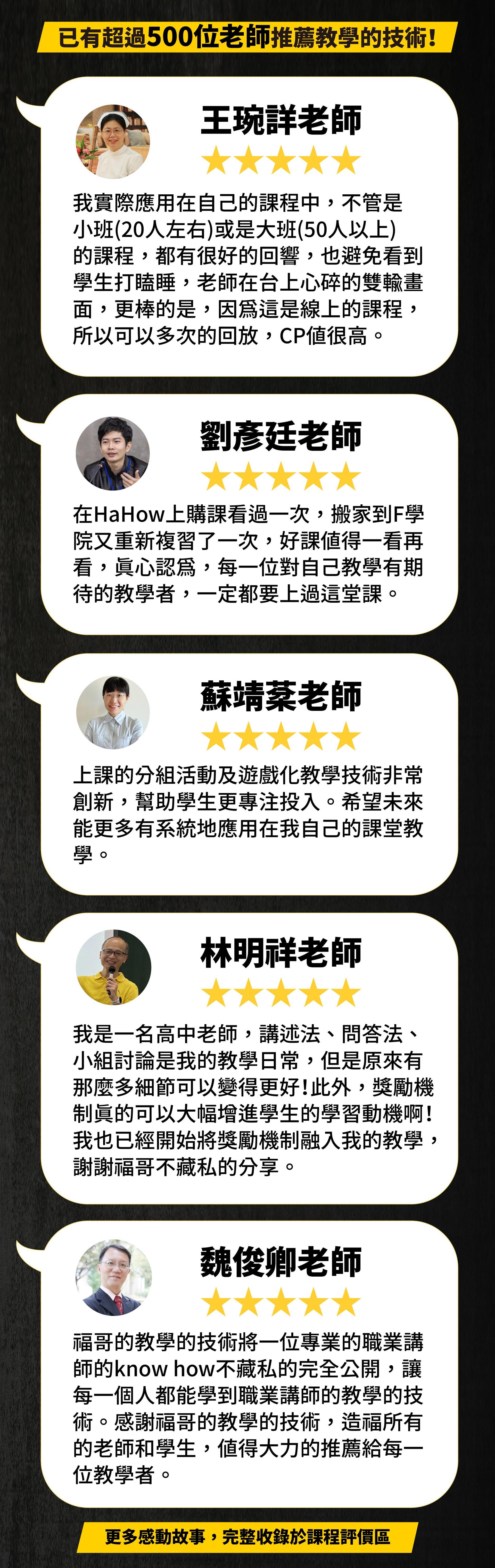答:有許多大家熟悉的教學專家與大神們,都真誠的推薦。像是林怡辰老師說「我真心期盼,每個教學者都聽過上過這門課」,毛鈺棻律師說「看完照做,保證您也能引燃學生之學習熱情,翻轉課堂」,台大教授葉丙成老師說「推薦想在教學上精進的夥伴」、謝文憲哥說「台灣推展教學技巧的第一把交椅」、還有許多專家的推薦。先前在 Hahow 平台上架時,也得到超過300份五星評價。