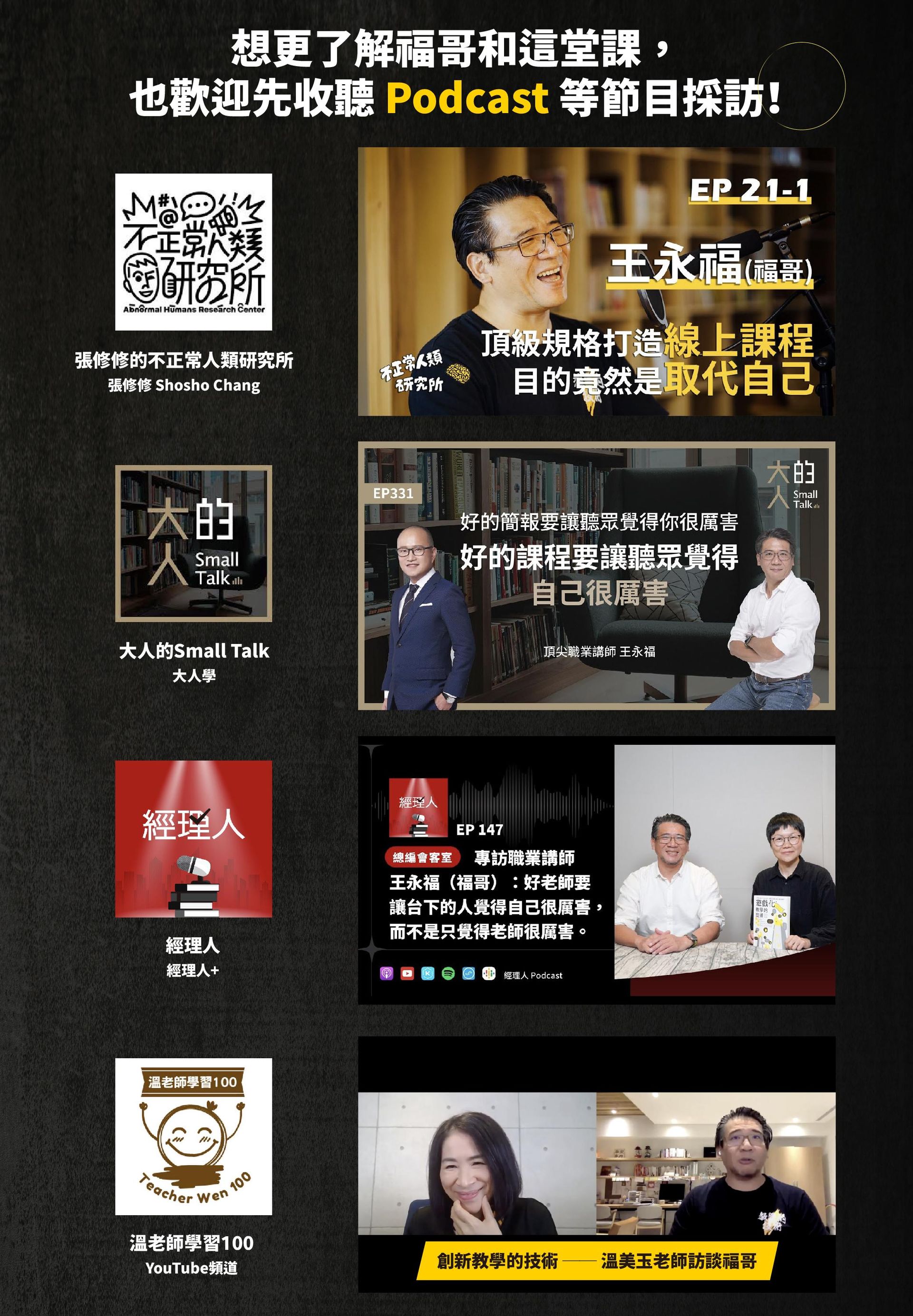 突破一般線上課程「純講述」模式,運用三機三鏡,搭配教學工作坊實境示範,帶你進入職業講師教學現場!國內首次利用線上課程,揭露頂尖職業講師的教學 Know-How。由暢銷書《教學的技術》、《上台的技術》作者、頂尖企業講師王永福(福哥)親自講授。