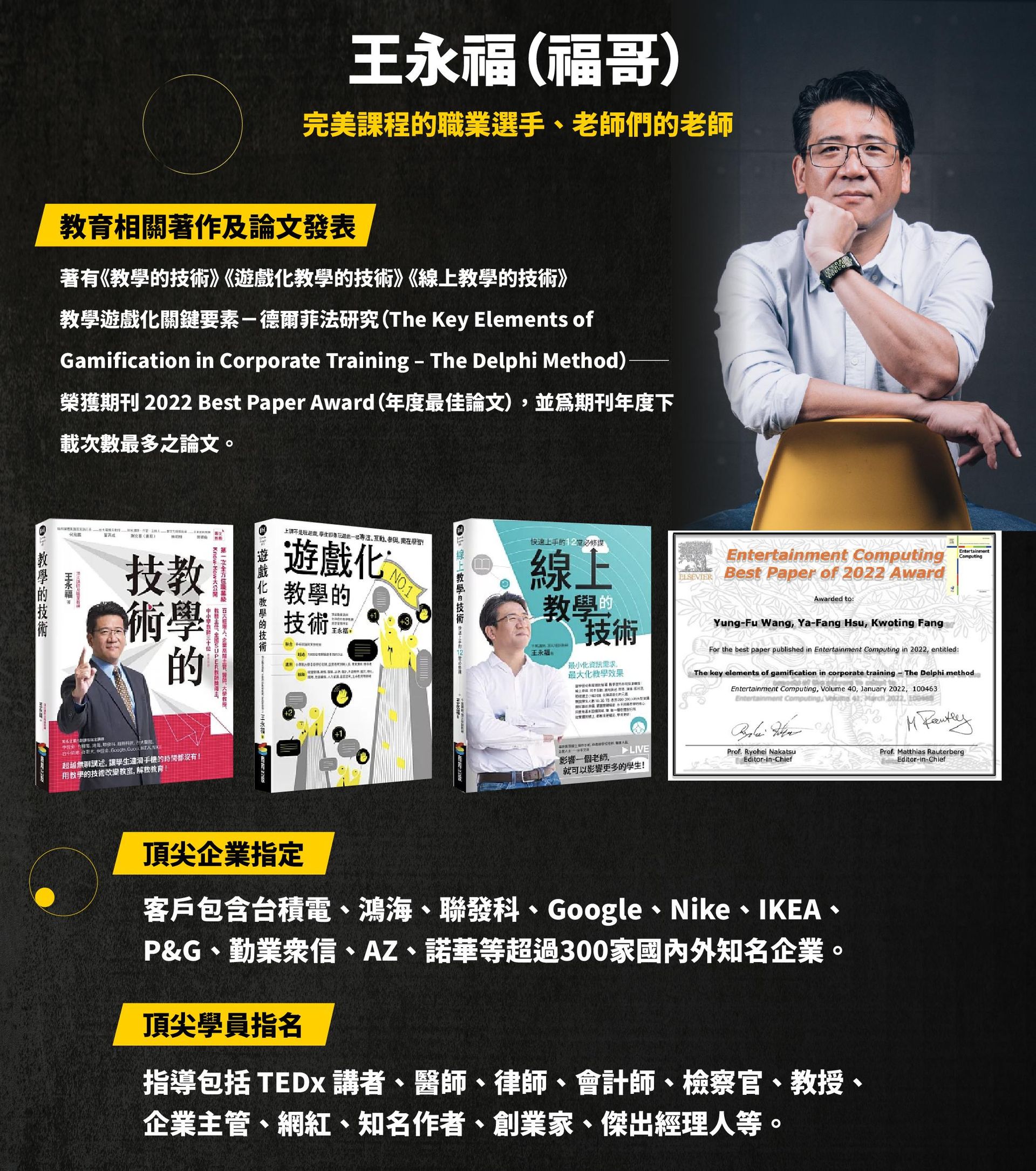答:福哥除了在實務的企業教學現場應用超過15年以上外,也寫在博士論文提出「三角學習理論」,為「教學的技術」線上課程提供堅實的理論基礎。另外課程中提及的「遊戲化教學」,福哥也寫了「Gamification Key Elements」的期刊論文,並獲得 2022 Best Paper Award 年度最佳論文。因此這個課程以實務為主、理論為輔,更有數千個實作案例佐證。