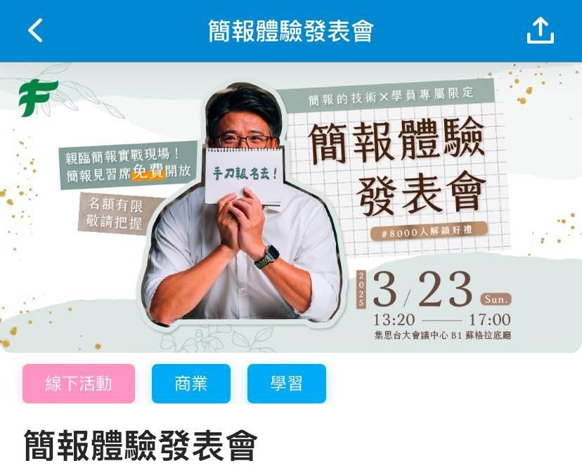 「這場簡報體驗會真的收穫滿滿。讓我看見一場好簡報該如何做到:一開始就抓住注意力、用故事引發共鳴、在過程中建立信任感,最後自然地做到 Call to Action。