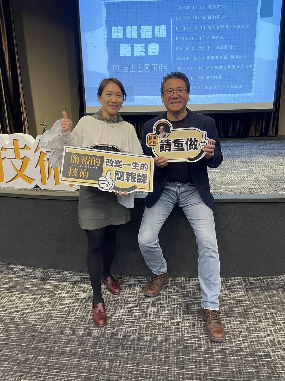 「從上台的技術(簡報的技術線上課)認識福哥,但我沒想到有一天居然能參加福哥真人教練的「實操演練」講座。簡報演練結束, 福哥親自上台簡報分享真正的時間管理大師「過去一年、未來一年」的工作+家庭生活經驗,連遊玩的時間也在剪影片,10分鐘的影片要花15小時,果然,不放過自己的人其實都是自己。」—— Amoly Chang(點我閱讀推薦全文)
