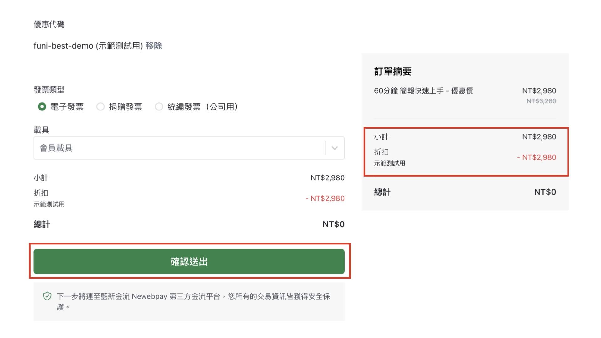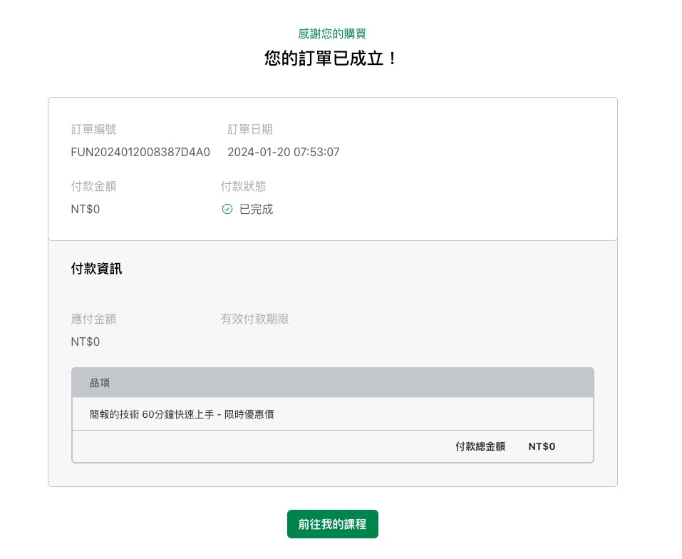 4.確認送出:登入或註冊成功後,會回到原本畫面,這時右側確認金額應該還是為0,按下方「確認送出」,無需支付任何費用,就可以準備觀看課程了。