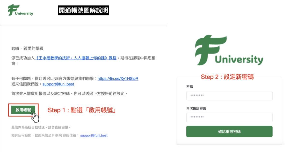 (2)審核通過:小幫手會寄送開通信件至您指定的Email,您可按以下步驟開通F學院帳號。