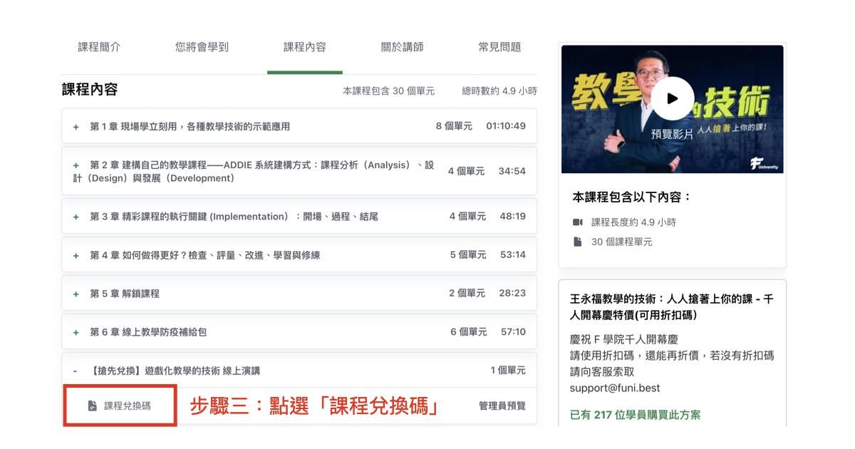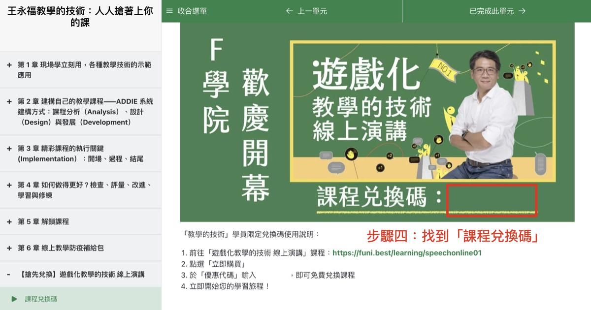 - 教學的技術學員:11/15 課程上線當日起,即可搶先兌換!您將可於「教學的技術」課程單元內,找到「遊戲化教學的技術 線上演講」課程兌換碼,即可使用兌換碼免費兌換課程。